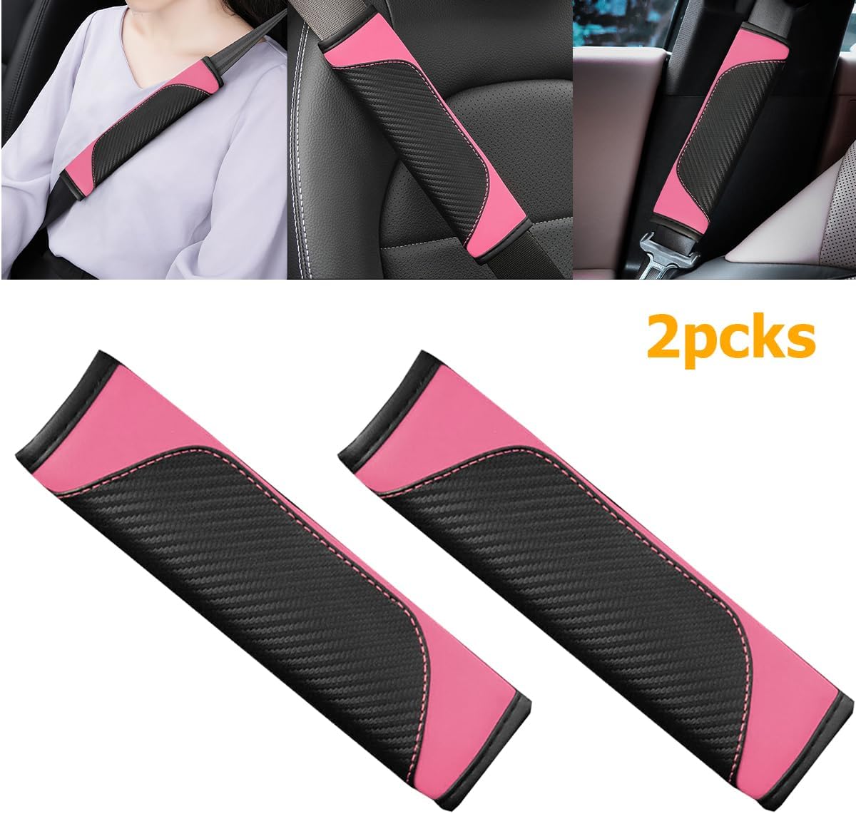 Specifications: Material: Leather Color: Black, Black/Red, Black/Blue, Black/Purple, Black/Wine Red, White, Beige, Pink, Black/Gray, Dark GreenSize: 2.6 x 9.1 inches Weight: 0.05kg Package Include: 2 x Car Seat Belt Cover Do you encounter the following problems? -The seat belt is too stiff and makes your shoulder uncomfortable. -The rubbing of the seat belt make your skin itchy. -The seat belt can pull on your knitted top, causing it to pilling or warp. -The seat belt cannot be kept in place during driving. Our seat belt shoulder cover solves the above problems for you, and provides you with more ways to use: 1. When you drive, the carbon fiber seat belt shoulder cover is stylish and beautiful. 2. When you travel, install it on luggage to reduce stress and make travel more comfortable. 3. When you work, install it on the seat handle, you will feel comfortable.