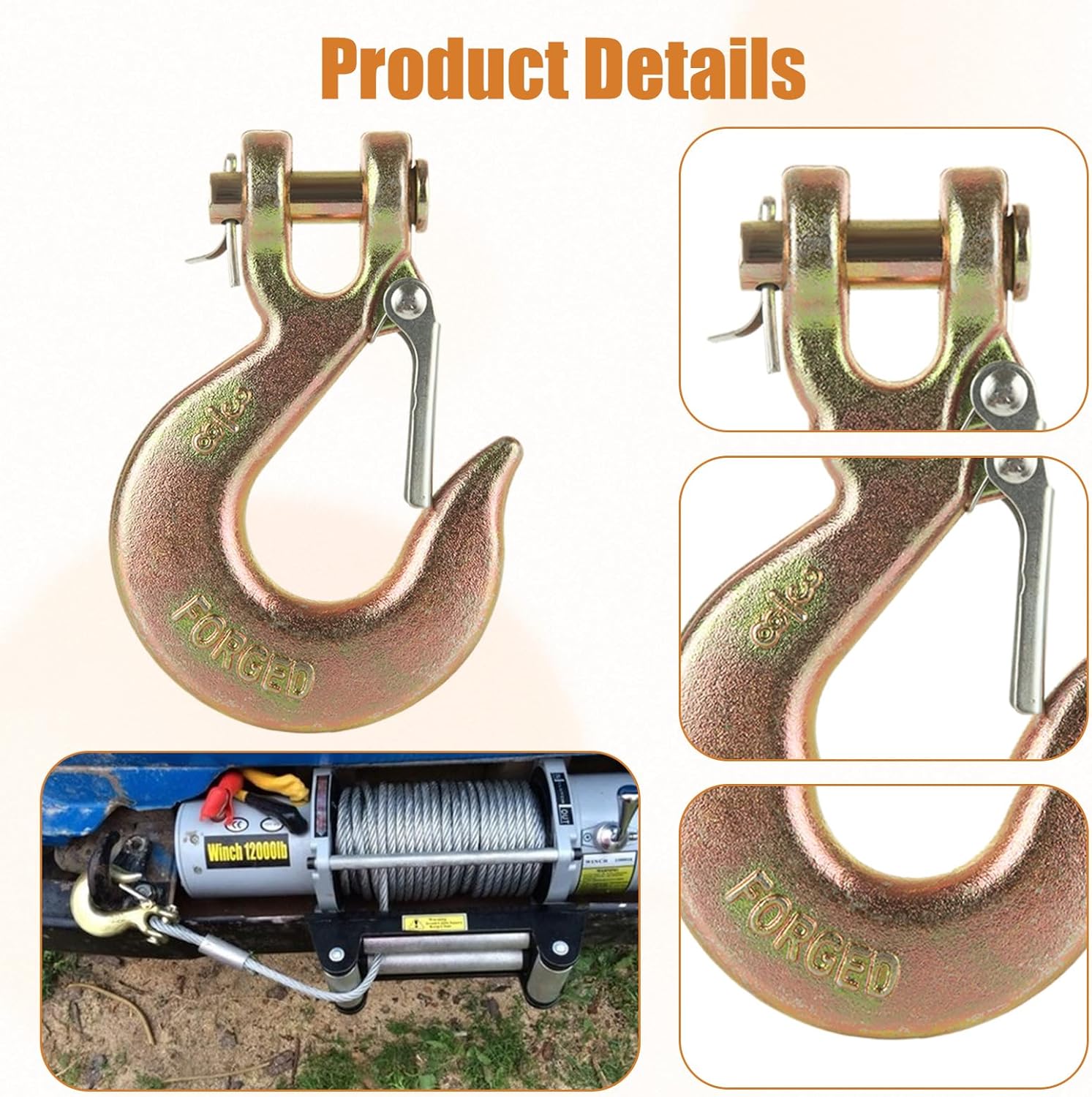 • Heavy Duty Clevis Slip Hook: Chain hook constructed from G70 Forged Steel with Precision Heat Treatment and Gold Zinc-Plated Finish, durable for outdoor use