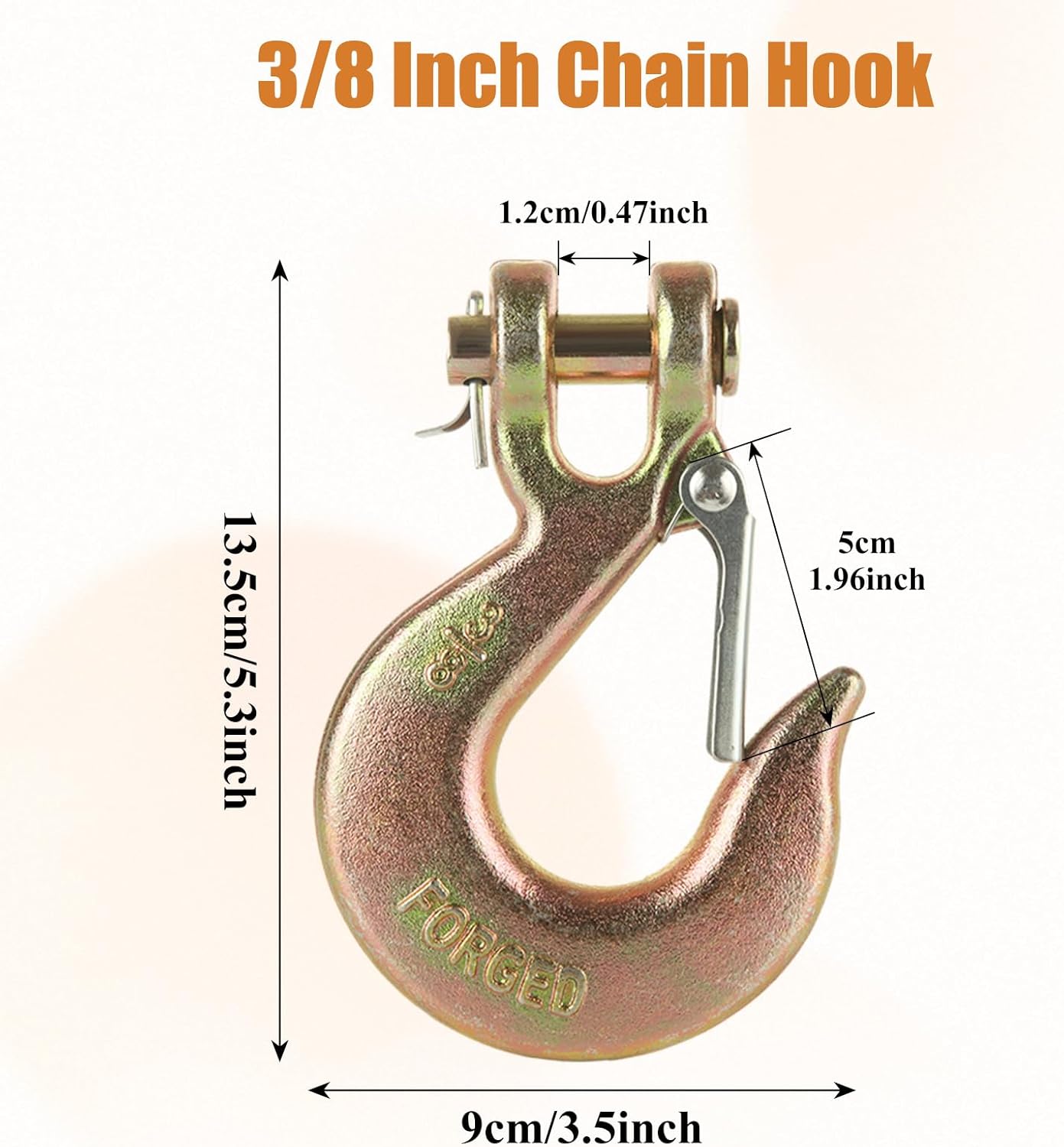 • Spring-Loaded Safety Latch Chain Hook: 3/8 clevis slip hook designed with a spring-loaded latch for secure attachment (prevent accidental disengagement and ensure your cargo safe and secure during transport) and quick release from trailer to tow vehicle